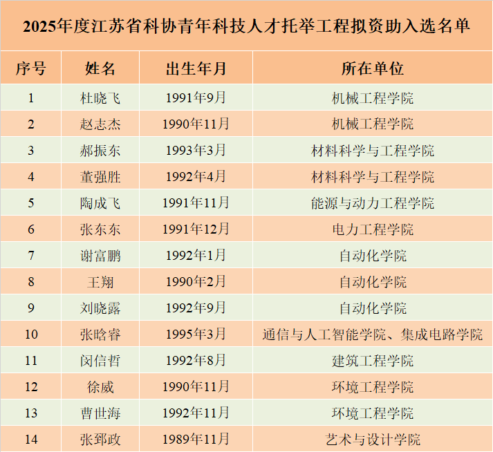 近日,江苏省科协公布2025年“青年科技人才托举工程”资助对象名单,我校14名青年教师入选。江苏省“青年科技人才托举工程”是由江苏省科学技术协会组织实施的人才项目,培养时间为2年。项目旨在支持青年科技人才在创造力“黄金期”潜心研究、深入探索,尽快成长为高层次科技创新人才的储备力量。我校高度重视青年科技工作者的成长,近年来,持续加大投入,强化学科平台建设,打造高水平科研团队,促进跨学科交流与合作,为青年...