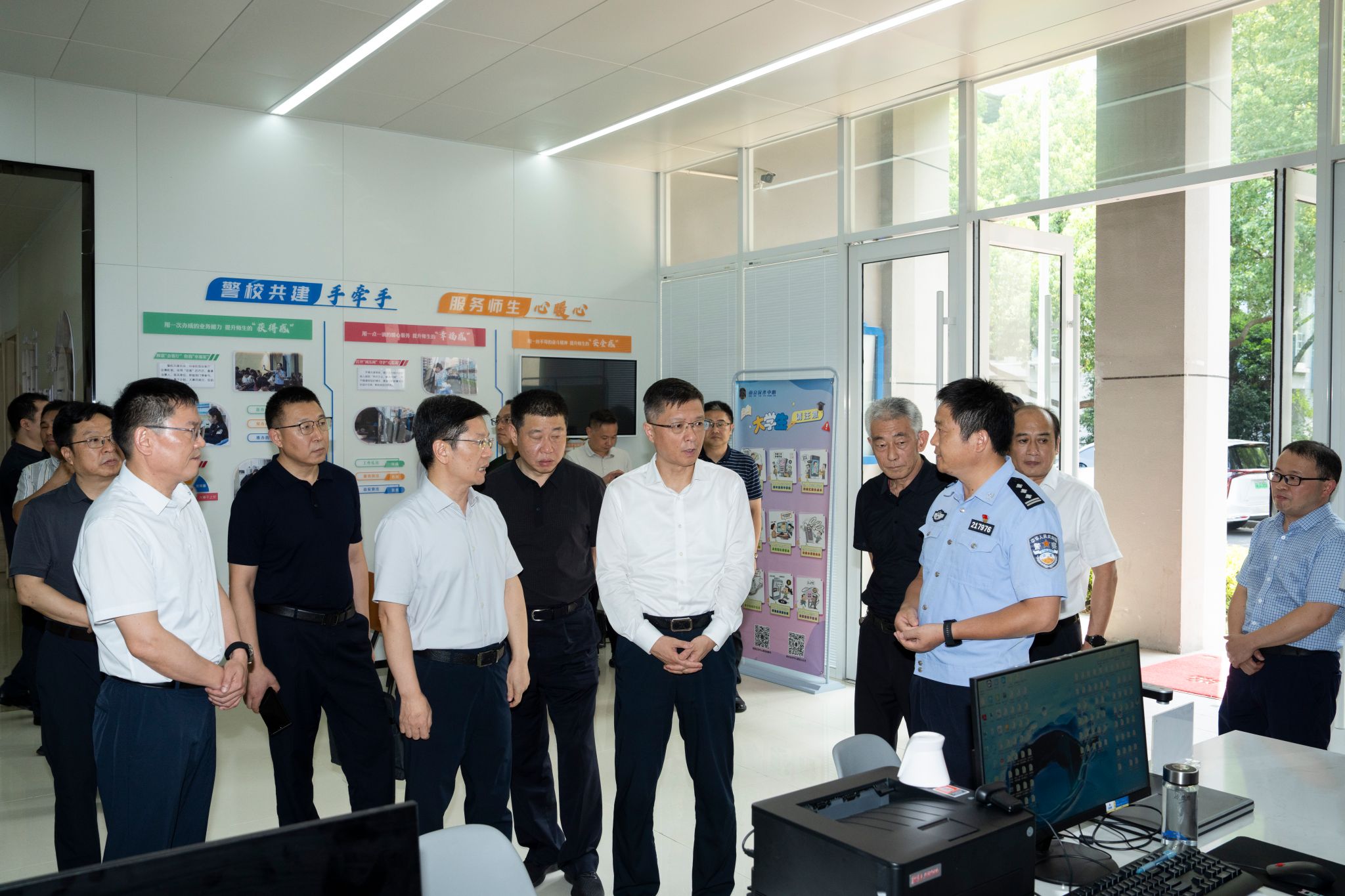 8月5日下午,无锡市委政法委常务副书记邹立群率考察组一行11人莅临我校,就高校政治安全、校园稳定、治安管理及校地协作机制建设等重点工作进行专题调研。党委副书记濮励杰,江宁区委常委、政法委书记庞志贵等陪同调研。考察组实地走访了驻校警务室及江宁区政法委驻校服务工作站,全面查看硬件设施配置,重点了解警校联动机制运行实效,并详细询问驻校警力配备、日常勤务模式及工作职责分工等情况。驻校民警结合具体案例,向考...