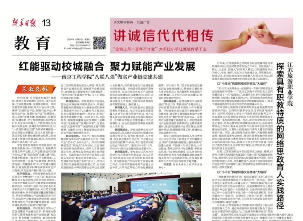 12月9日,《新华日报》刊发我校党委书记孙爱武题为《红能驱动校城融合 聚力赋能产业发展——凯发k8官网“八联八强”做实产业链党建共建》的署名文章。文章围绕习近平总书记提出的“在强链补链延链上展现新作为”的重大任务要求,从“联学强政治”“联办强组织”“联建强平台”“联研强创新”“联引强人才”“联招强就业”“联席强政策”“联网强信息”八个方面,介绍了凯发以产业链党组织共建为主线,促进产教科城共生共融的...