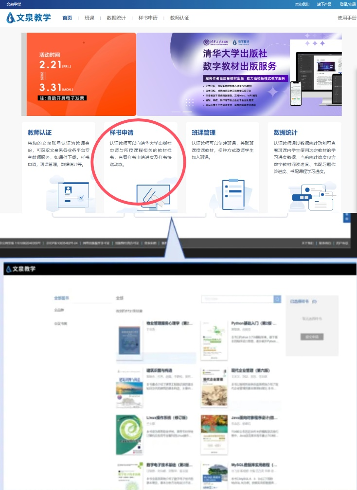图书馆新购买的《清华文泉学堂知识库》是以清华大学出版社独家资源为核心,聚合国内知名大学出版社精品资源,以专业图书和学术专著为主,并配套多媒体附件、课件等资源,内嵌教师服务功能,为任课教师提供样书申请服务。专业教材纸书免费申请赠送,免邮费,4本/年,欢迎我校教师申请此项服务,申请流程如下: