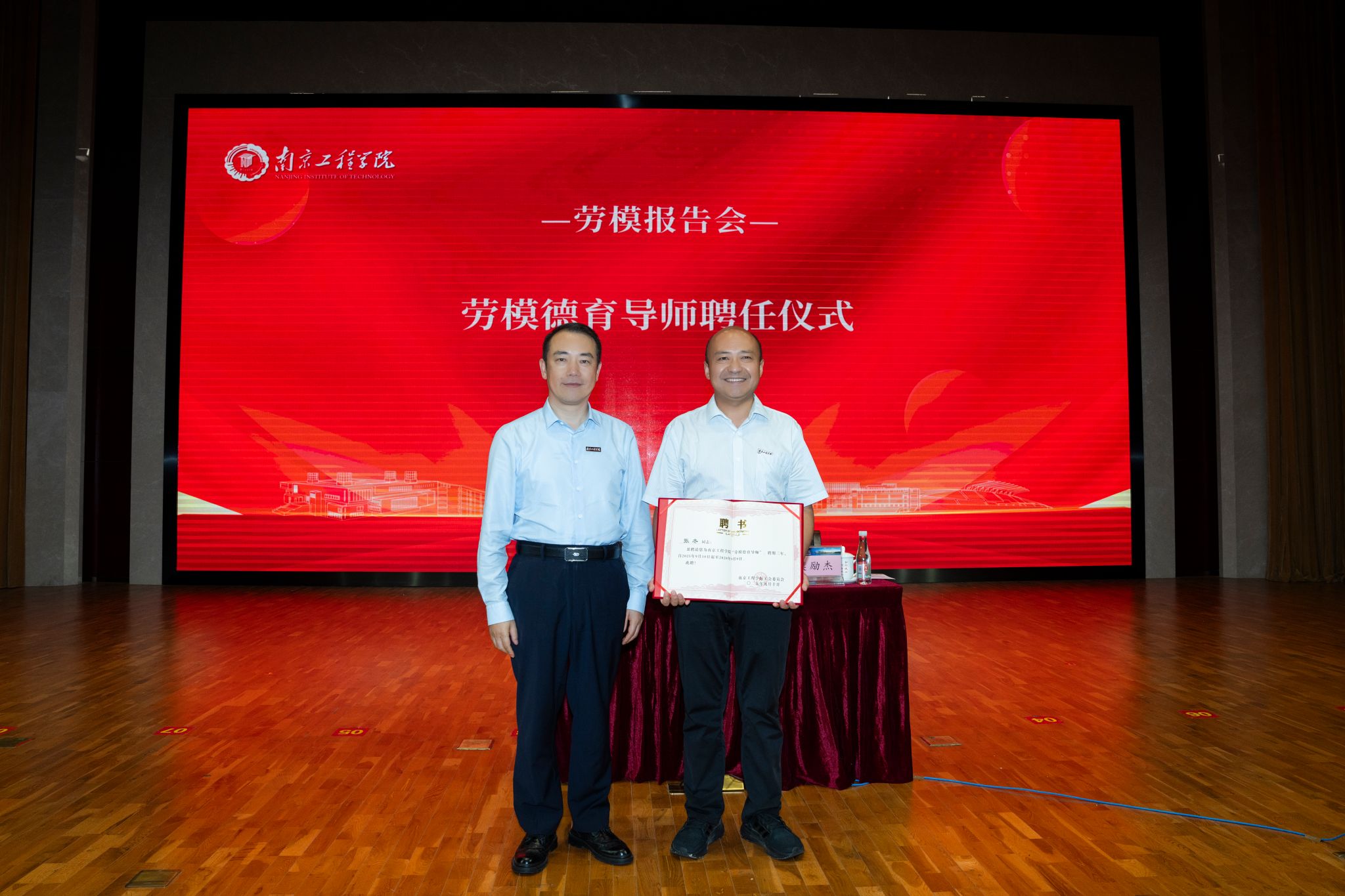 活动还邀请到全国五一劳动奖章获得者、我校校友、国网淮安供电公司电网运维分公司张冬作主题报告。他向母校老师致以诚挚的节日问候,对母校的悉心培养和精心教导表示感谢,并回顾了在校学习、生活的点滴,分享了在职业道路上执着专注的故事和技能锤炼、敬业奉献的经验。在与会人员的共同见证下,张冬受聘为我校“劳模德育导师”。