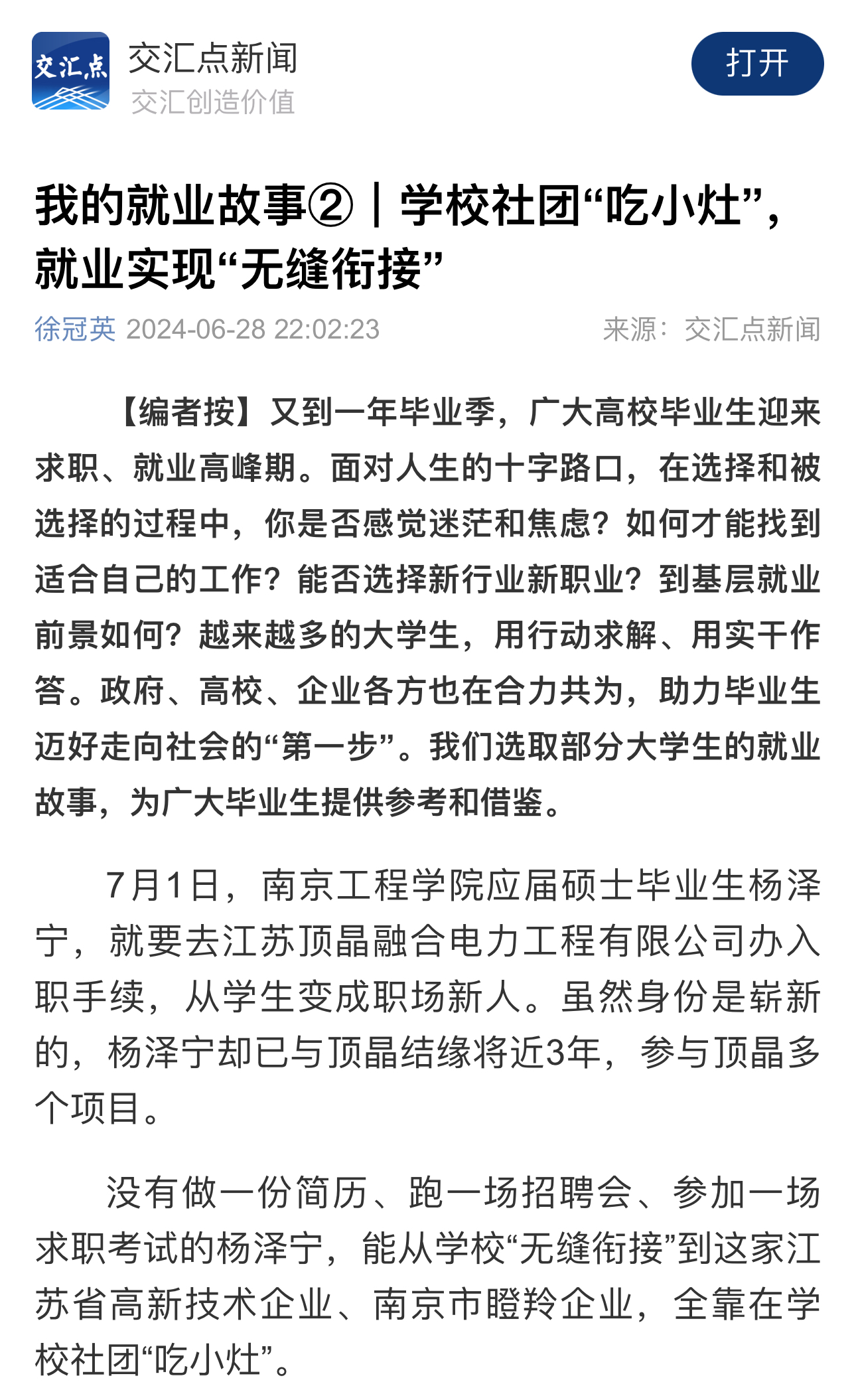7月1日,凯发k8官网应届硕士毕业生杨泽宁,就要去江苏顶晶融合电力工程有限公司办入职手续,从学生变成职场新人。虽然身份是崭新的,杨泽宁却已与顶晶结缘将近3年,参与顶晶多个项目。