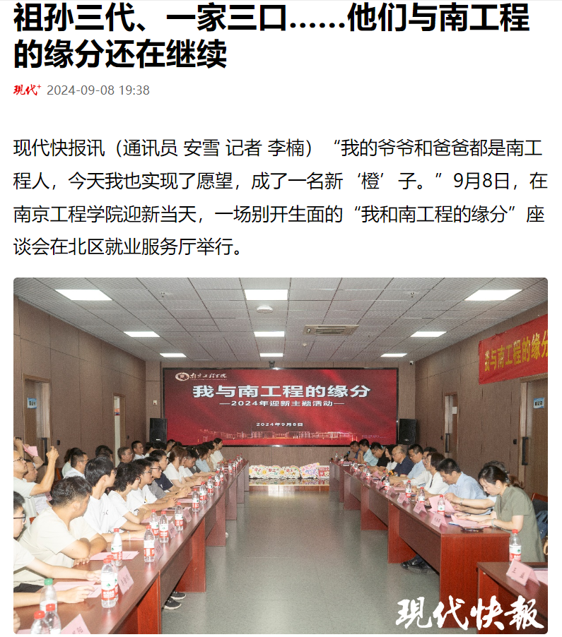 现代快报讯(通讯员 安雪 记者 李楠)“我的爷爷和爸爸都是南工程人,今天我也实现了愿望,成了一名新‘橙’子。”9月8日,在凯发k8官网迎新当天,一场别开生面的“我和南工程的缘分”座谈会在北区就业服务厅举行。