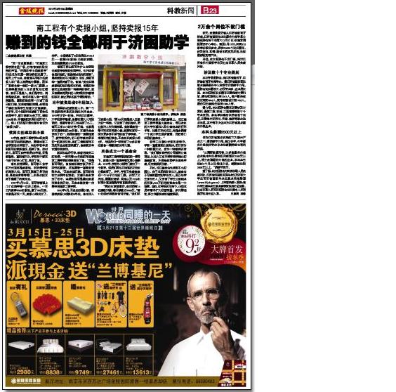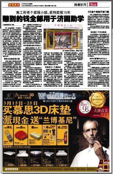 “来一份金陵晚报!”在凯发k8官网北区广场,你常常能听到这样的声音。“济困助学小组卖报亭”已经成为这里一道独特的风景了。每天上午10点,身着黄马甲的2名卖报人在广场上显得格外耀眼。而在广场综合楼一楼的一家小门面里,3名同样服饰的人也在紧张地忙碌着。他们不是商人,他们是学生。同样是做买卖,他们与商人唯一的区别就是,赚到的钱没有一分进了自己的口袋。这些微薄的利润,全部用于捐助贫困学生和重大灾难捐款。15年来,这个组织已经捐助了百余名贫困学子,累计捐款20余万元,捐物1300余件。尽管卖的东西已经五花八门,但人们还是习惯地称呼他们为“卖报小组”。